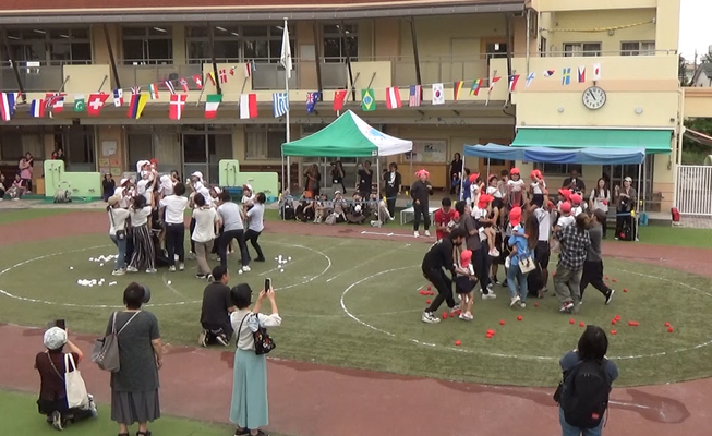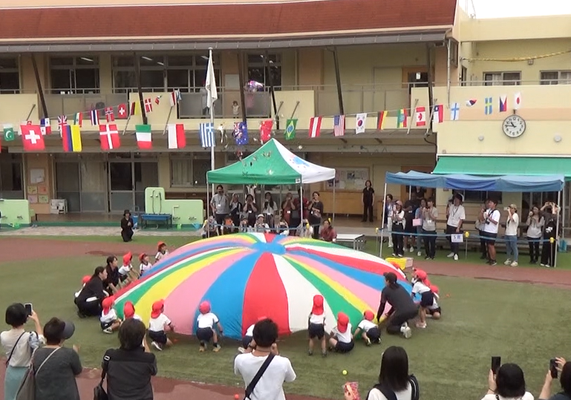 あんず組さんは、みんなで協力しながらパラバルーンの技に挑戦し、練習の時よりも高く花火が上がり、みんな笑顔で力を合わせて頑張りました。